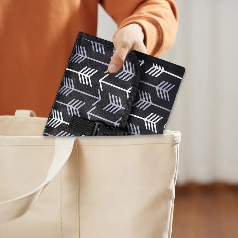 Compact & Stylish Design: When folded, it transforms into a sleek, lightweight clutch that fits easily into any larger bag or can be carried on its own. The modern, minimalist patterns are designed to complement your style.